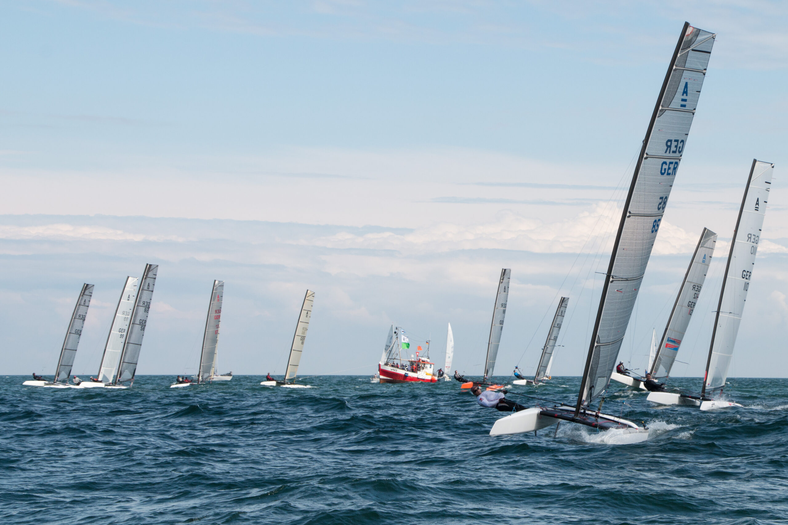 Außerdem, sicherlich vorrangig zum Lernen, war Roberto Steinke mit seinem A-Cat dabei. Die schwierigen Bedingungen auf dem Kurs weit draußen auf der Ostsee schlagen sich dann aber auch direkt und unverholen in der Liste wider. Trotzdem sind wir gespannt, was für Boost seine Erfahrungen in Warnemünde für das Greifswalder High Performance Segeln geben wird.
