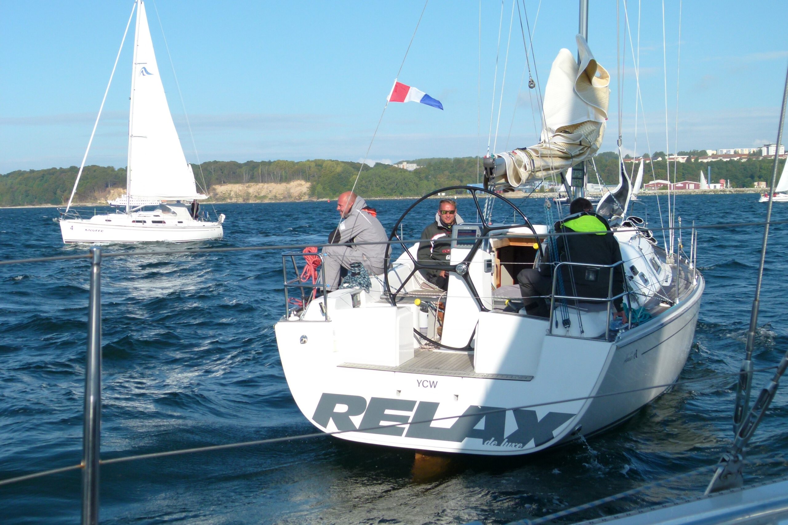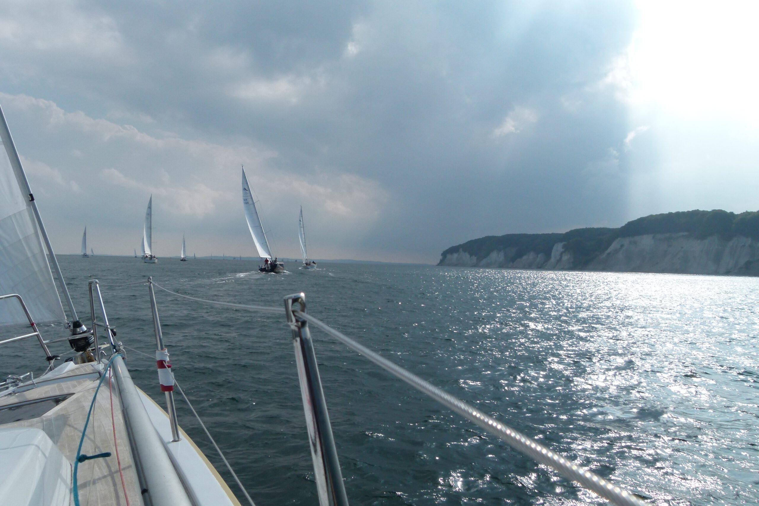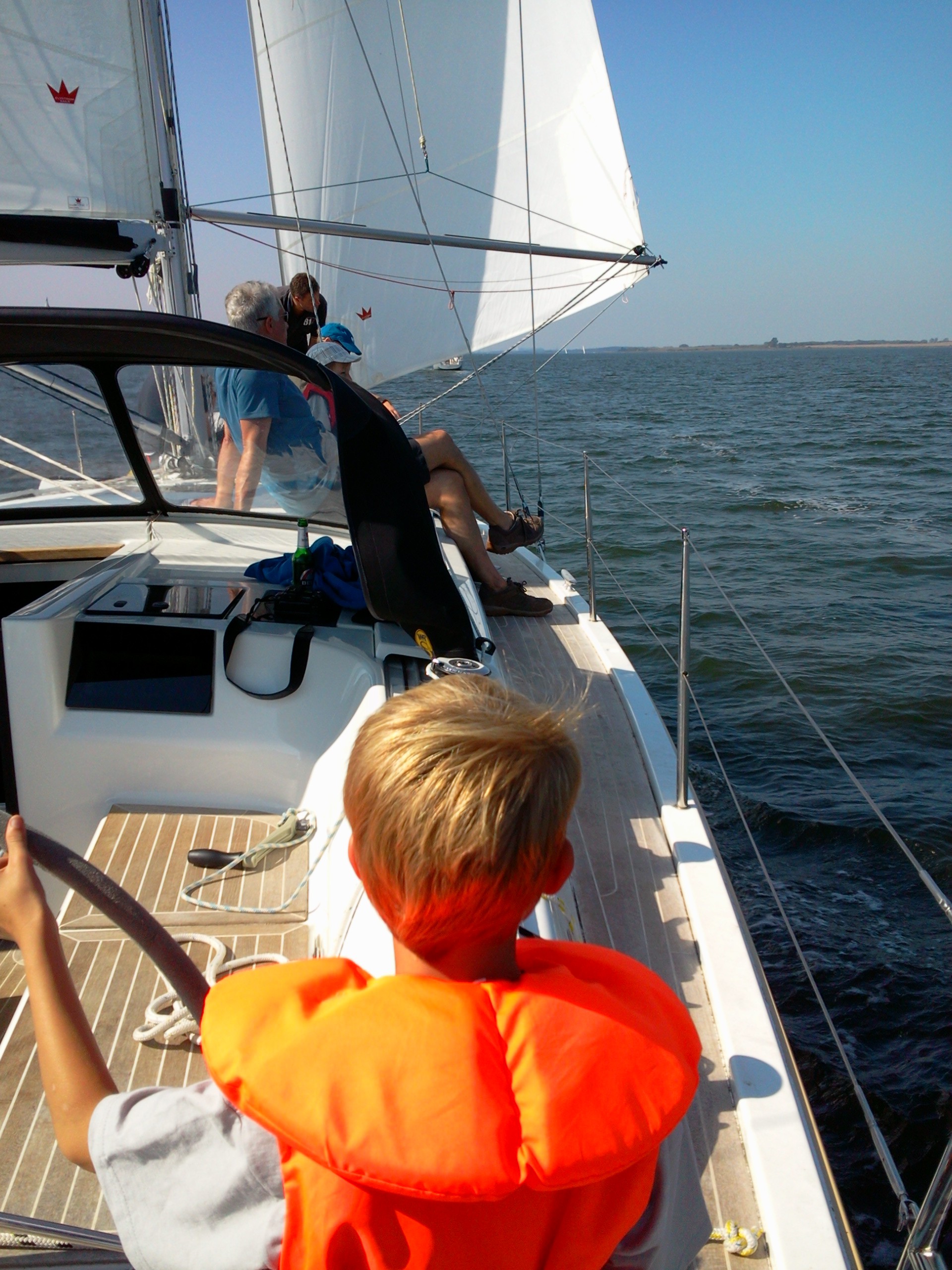 Auf der ersten Leichtwindetappe konnte die Crew gleich einen 6. Platz in der hart umkämpften Gruppe 3 einfahren. Die top ausgerüstete, dafür aber knapp 8 Tonnen schwere Yacht lief also besser als erwartet – sogar platt vorm Laken. Die Überraschung, dass auch Ofen, Warmwasseranlage, Badeplattform, 200l Diesel und volle Wassertanks kein Hinderniss für erfolgreiche Leichtwindwettfahrten sind, wurde dann in der nächsten Wettfahrt westlich vor Hiddensee bestätigt. Bei keinem bis gar keinem Wind hatte sich die „Senfkuh“ kontinuierlich unter Land nach vorne geschaukelt und konnte sogar einen 3.Platz feiern. Und das nach den Gerüchten, dass das Schiff nur bei viel Wind fährt. Vor versammelter Gesellschaft auf Hiddensee nahm Optisegler Timo Neudert aber die kleine Trophäe als deutlichen Gegenbeweis entgegen.