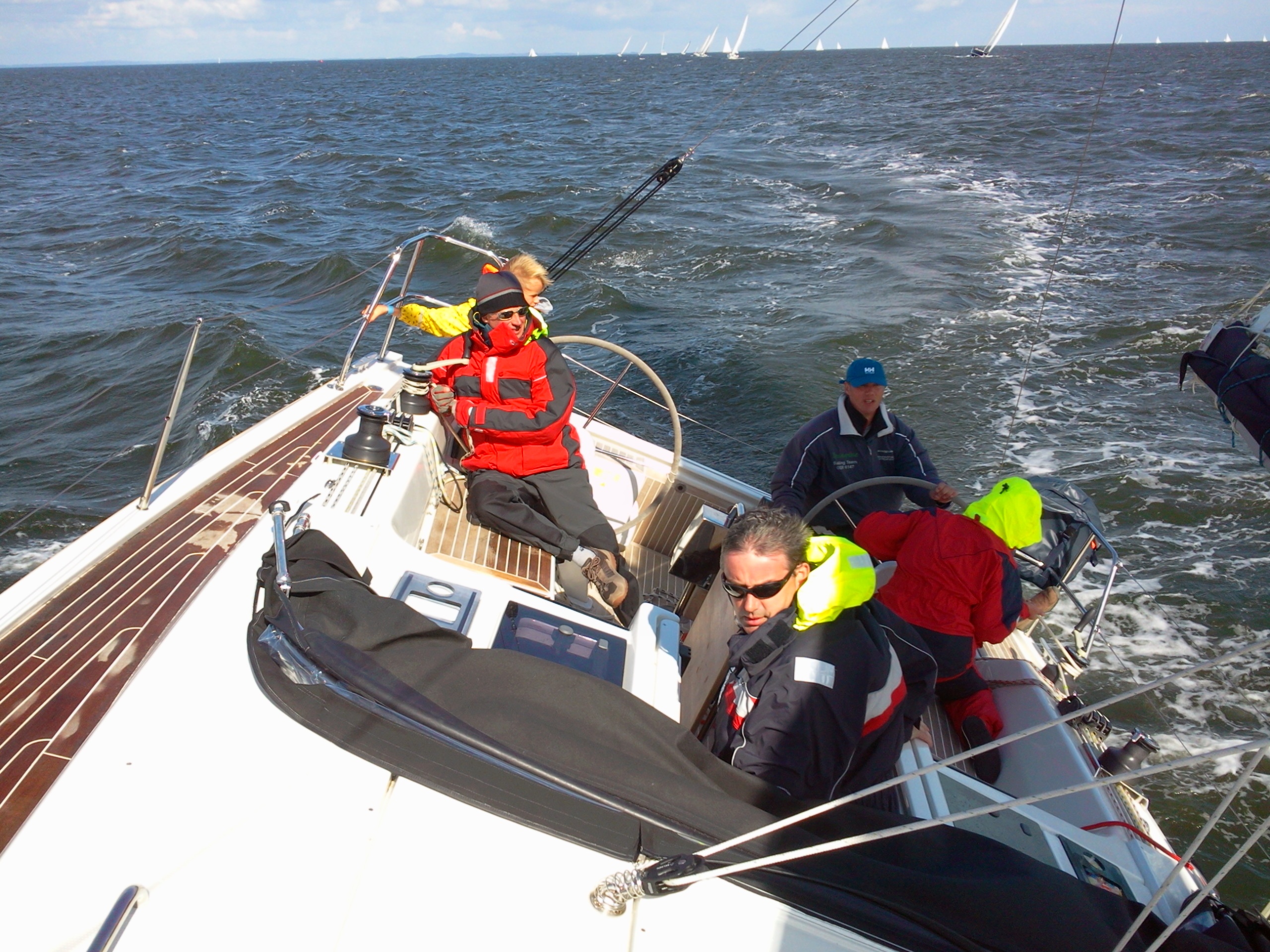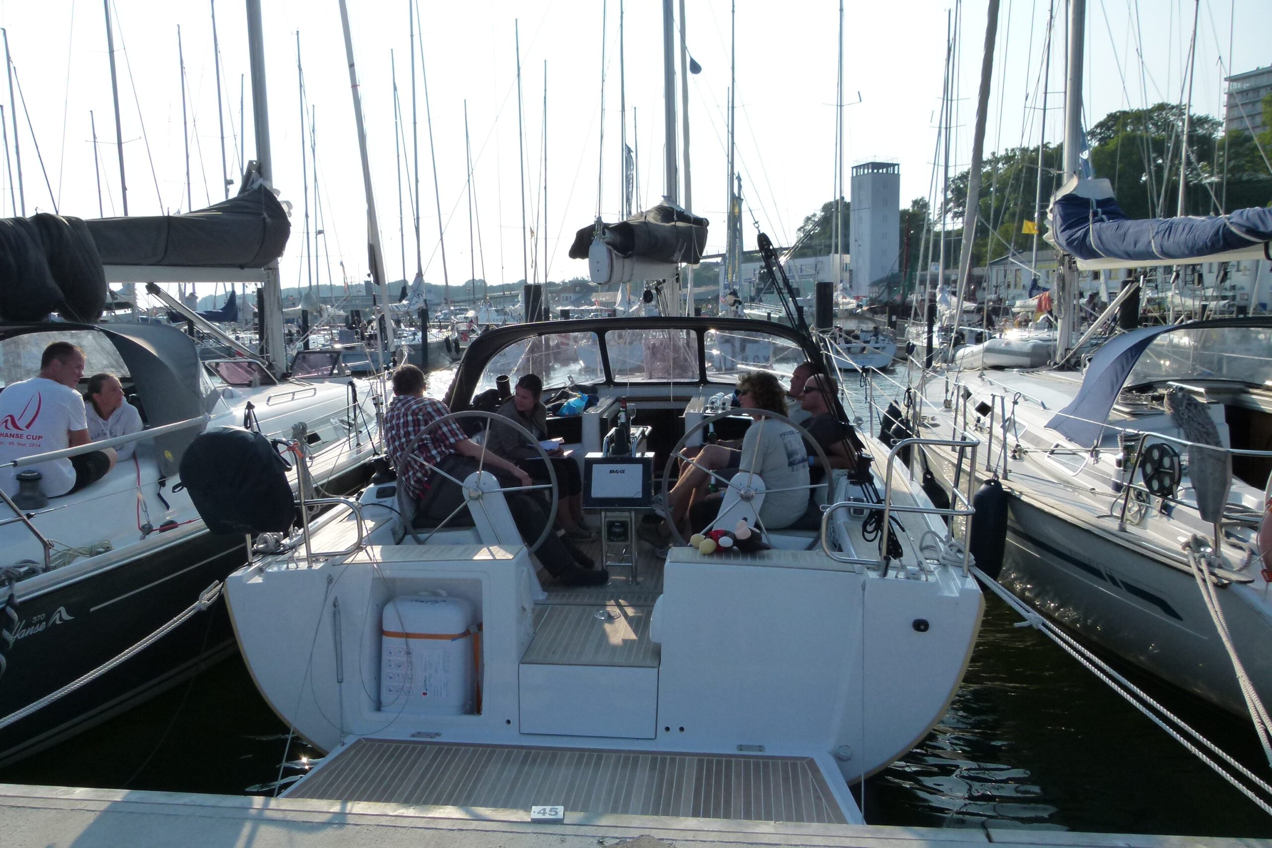 Auf der Etappe nach Sassnitz hat die Mannschaft dann wohl zu laute Reggae Musik über die fette Anlage gehört … oder hat der riesige Plotter und die Navi-Anzeigen zu viele Funktionen und schöne bunte Bildchen angezeigt … oder war einfach nur die tolle Natur an Steuerbord schuld? Auf jeden Fall war da „nur“ ein 8. Platz drin. Aber das war natürlich sowieso nur die mentale Vorbereitung für die letzte Etappe zurück nach Greifswald. Bei 15-22 Knoten aus Südwest stand nämlich am letzten Tag eine lange Kreuz über den Greifswalder Bodden an. Und die sollte zum Offenbarungseid werden. Denn man konnte nur staunen, wie die “Senfkuh“ durch die bekannte kurze/steile Boddenwelle auf einmal los stampfte und alles rechts und links liegen ließ. Von den gleich großen Yachten mal gar nicht zu sprechen, lieferte sich die gut 11m lange Yacht einen Kampf mit den ganz großen, winkte großzügig 47Fußer vorne durch und wurde letztlich Zweiter hinter der wieder mal unschlagbaren Relax de Luxe. Auf einmal sorgte nicht mehr nur das “Smart Mooring System” für Gesprächsstoff, sondern auch die Upwind-Performance ab 18 Knoten Wind!Bei der abschließenden Siegerehrung wurde die außergewöhnliche Crew der Jugendabteilung als Gesamtvierter der Gruppe 3 gefeiert. Und als krönenden Abschluss überreichte der Oberbürgermeister sogar noch den Wanderpokal für die beste Charteryacht des diesjährigen Hanse Cups. Fährt ja also doch ganz gut diese Hanse 385!