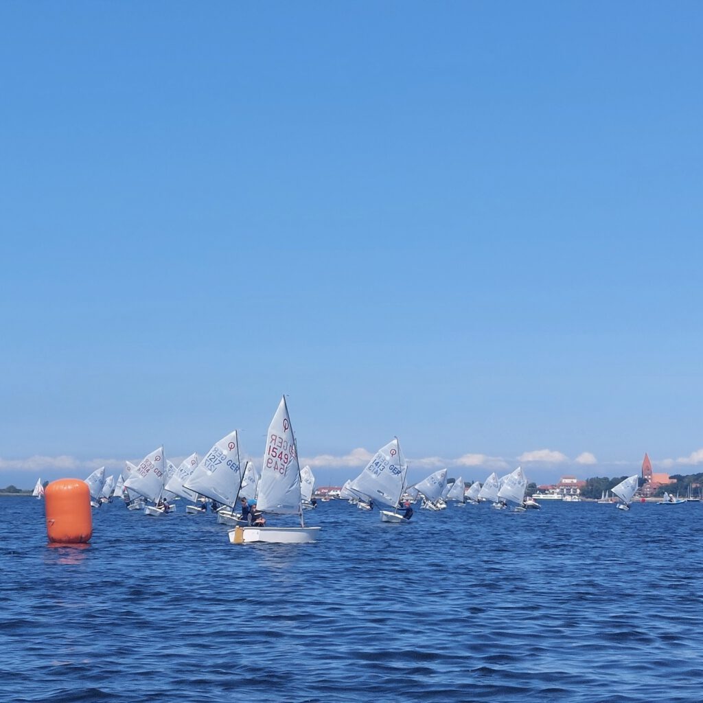 Traumhaftes Wetter in Rerik und die Greifswalder Opti Segler an der Spitze des Feldes.