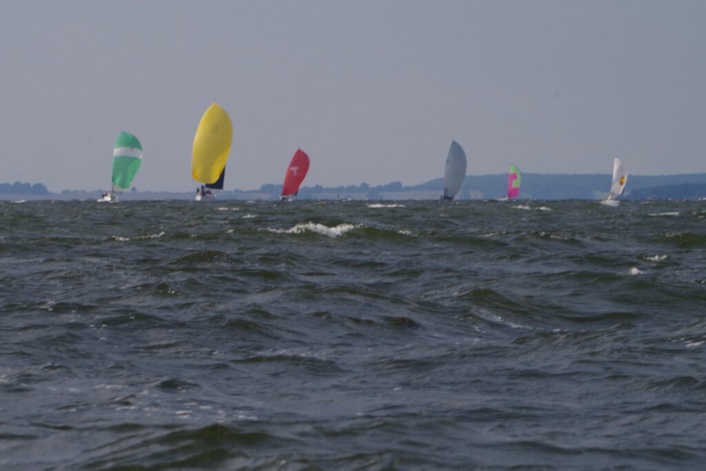 Am Samstag Morgen wurde es dann aber Ernst. Sonnenschein, 10-12 Knoten Wind aus West läuteten einen tollen Segeltag mit zwei schönen Wettfahrten von je 2,5 Stunden auf dem Greifswalder Bodden ein. Für viel Gesprächsstoff sorgte eine dicke Regenfront in der zweiten Wettfahrt, die den Wind in kurzer Zeit auf über 30 Knoten auffrischen ließ. Ein paar zerrissene Spinnaker später, hat sich der Großteil des Feld dann im neuen Boddenetappenhafen in Peenemünde Nord eingefunden.