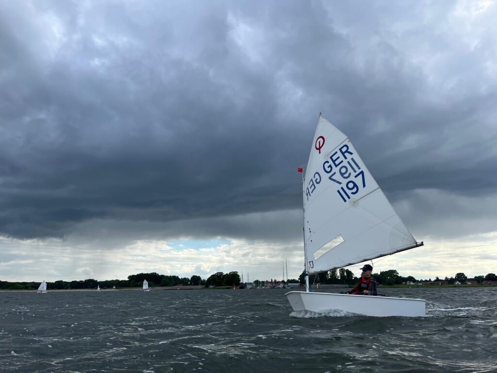 Der Sonntag startete mit Gewitter und heftigem Regen. Erst kurz vor Mittag entschied die Wettfahrtleitung einen letzten Startversuch zu unternehmen. Dies sorgte zunächst für lange Gesichter unter uns, doch am Ende konnten wir uns alle nochmal toll verbessern. Richtig gefreut haben sich auch Lenny und Valentin, die mit Platz 2 (Lenny) und Platz 4 (Valentin) ein tollen Abschluss in Opti B hingelegt haben. Beide freuen sich nun auf die vielen neuen und spannenden Herausforderungen die in Opti A auf sie warten.