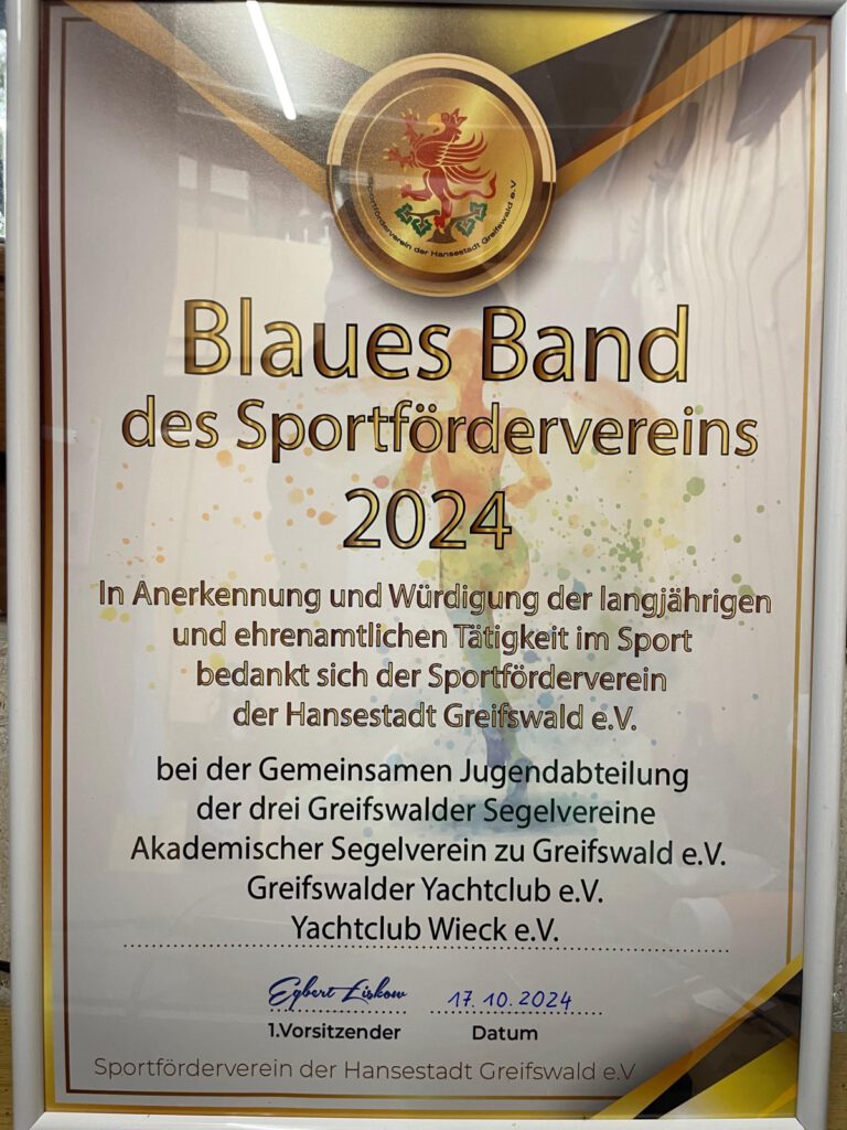 Aufgrund der hervorragenden sportlichen Leistungen und des großen ehrenamtlichen Engagements zeichnete der Sportförderverein der Hansestadt Greifswald e.V. im Oktober die gemeinsame Jugendabteilung der drei Greifswalder Segelvereine mit den Blauen Band 2024 aus, was mit einer Sportförderung in Höhe von 1000 Euro verbunden ist.