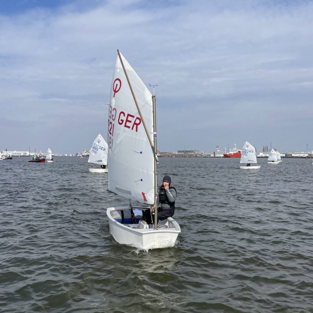 Die erste Opti-Regatta der Saison am vergangenen Wochenende hatte es in sich. Zur Fischereihafenregatta in Bremerhaven waren sechs Wettfahrten geplant, doch starker Ostwind mit Böen bis 40 Knoten machte den jungen Seglern das Leben schwer. Die erste und einzige Wettfahrt am vergangenen Samstag wurde nach zwei Dritteln abgebrochen, zu viele Kenterungen und Ausfälle zwangen das Feld zurück in den Hafen.